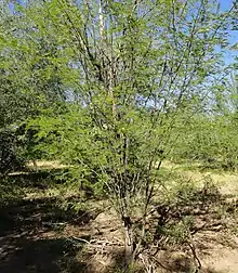 Es un arbusto o pequeño árbol que alcanza un tamaño de hasta 4,5 m (metros) de altura. Las hojas son parecidas a pequeñas plumas, las ramas maduras crecen vistosas, las espinas de las ramillas son conspicuas. Sus flores son amarillas y sus frutos son vainas aplanadas de 10 cm (centímetros) de largo.