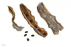 Sus frutos son legumbres anchas, aplanadas (4-8 cm x 1,5-2 cm), su madera es color rosáceo, veteado llamativo