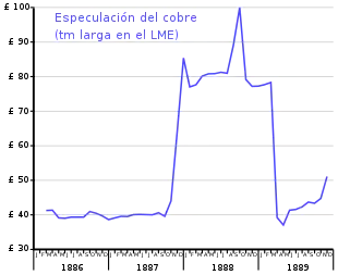 Eugène Secrétan comenzó a operar con estaño y plomo a finales de 1886. Pero poco después se dio cuenta de que las existencias mundiales de cobre se habían reducido a 40 000 tm, y que los precios habían caído por debajo de las 36 libras esterlinas por tonelada. Mediante acuerdos económicos por valor de unos sesenta millones de francos, pudo controlar las existencias internas con la ayuda de un grupo de financieros.[2] En tres meses, logró que los precios subieran a 84 libras por tonelada, y a continuación forjó una alianza con productores de cobre ingleses, estadounidenses, suecos y españoles, lo que le garantizó el control de tres años de producción y el equivalente a la oferta mundial, es decir, unas 540,000 tm.[3] Este "cártel" le permitió controlar los suministros, que esperaba revender a un precio elevado para obtener grandes plusvalías. Las existencias de cobre acumuladas se comprometieron rápidamente como garantía para sus acreedores, y la especulación intervino en el rápido estrangulamiento del mercado.
