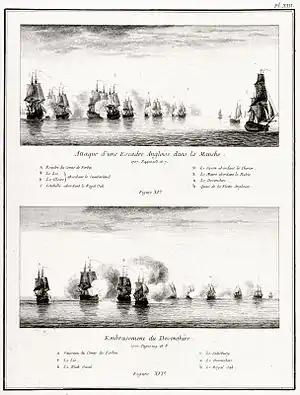 El 1 de mayo, un gran convoy hacia el exterior de las Indias Occidentales , bajo la protección de tres barcos de la línea, navegó desde las Llanuras y estando a seis leguas al oeste de Beachy, se enfrentaron con el escuadrón francés de Dunkerque, comandado por Claude de Forbin. Este escuadrón consistió en 7 velas de la línea y 6 corsarios. [7] La acción comenzó cuando 3 barcos franceses, Griffon , Blackoal y La Dauphine , lucharon contra Hampton Court y mataron al capitán Clements. El comodoro Wyld tomó cinco de sus buques mercantes más grandes en su línea y audazmente se encontró con el ataque de los barcos franceses. [8] Durante dos horas y media se mantuvo un gran fuego en ambos lados; Tribunal Hamptonluchó desesperadamente y se vio obligado a rendirse. [9] La Dauphine luego atacó vigorosamente a Grafton y cuando se unieron a los barcos franceses Blackoal y Fidele , la capturó después de una disputa cálida de media hora. [10] Marte de 60 cañones de Claude Forbin atacó Royal Oak del comodoro Wyld . El barco, que tenía once pies de agua en su bodega, logró escapar con grandes pérdidas al correr a tierra, desde donde fue llevada a los Downs. [11]