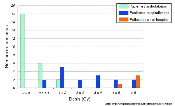 Muchas otras personas sobrevivieron a pesar de haber recibido altas dosis de radiación, posiblemente porque la dosis fue recibida de forma muy fraccionada, lo que pudo ayudar a que el cuerpo activara mecanismos de prevención de daños por radiación. La dosis recibida por los 46 afectados que presentaron más contaminación se resume en el gráfico siguiente.