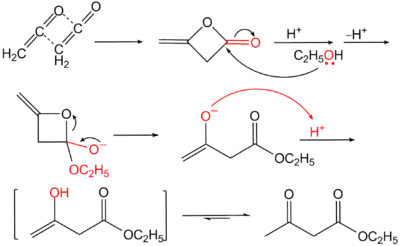 El acetoacetato de etilo se produce industrialmente por tratamiento de dicetena con etanol.[2]