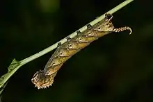 La hembra deposita los huevos en plantas hospederas que pertenecen a las familias Solanaceae, Verbenaceae, Oleaceae, Bignoniaceae y otras. Las larvas son verdes o gris azulado. Cuando maduran caen al suelo donde excavan un refugio donde proceden a pupar.