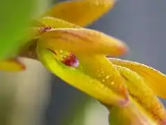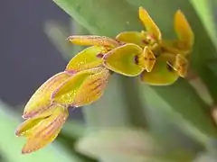 Las plantas son de tamaño mediano a pequeño, con el crecimiento de tallos pequeños, cespitosos, robustos tallos cilíndricos y hojas de óvalo alargado, con una corta inflorescencia con flores amarillas y luego naranja, con bordes suaves y labelo púrpura violeta y pequeñ pétaloss finales mucronados, translúcidos, con manchas de color púrpura en el extremo inferior.[1][2]
