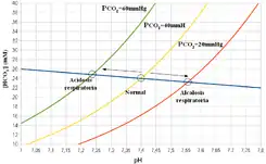 La acidosis respiratoria puede ser aguda o crónica. En la acidosis respiratoria aguda, la PaCO2 se encuentra elevada por encima del límite superior del rango de referencia normal (más de 6,3 kPa o 45 mmHg) con una concomitante acidemia (pH < 7,35).[1]
