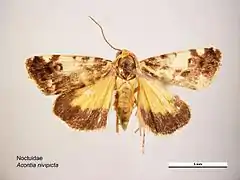 - Esta obra contiene una traducción derivada de «Acontia crocata» de Wikipedia en inglés, publicada por sus editores bajo la Licencia de documentación libre de GNU y la Licencia Creative Commons Atribución-CompartirIgual 3.0 Unported.