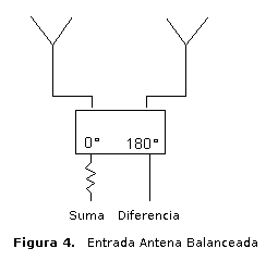 Si se usan líneas adaptadas en fase para una entrada de antena hacia un acoplador de 180 grados, como se muestra en la Figura 4, se producirá un nulo directamente entre las antenas. Para recibir una señal en esta posición se debería cambiar el tipo de híbrido o la longitud de la línea. Esta es una buena aproximación para rechazar una señal desde una dirección determinada o para crear el patrón de diferencia para un radar monopulso.