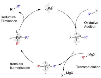 De acuerdo con el mecanismo ampliamente aceptado, se entiende que el acoplamiento de Kumada catalizado por paladio es análogo al papel del paladio en otras reacciones de acoplamiento cruzado. El ciclo catalítico propuesto involucra estados de oxidación de paladio (0) y paladio (II). Inicialmente, el catalizador de Pd(0) rico en electrones (1) se inserta en el enlace R-X del haluro orgánico. Esta adición oxidativa forma un complejo organo-Pd(II) (2). La transmetalación posterior con el reactivo de Grignard forma un complejo heteroorganometálico (3). Antes del siguiente paso, es necesaria la isomerización para llevar los ligandos orgánicos uno al lado del otro en posiciones mutuamente cis. Finalmente, la eliminación reductora de (4) forma un enlace carbono-carbono y libera el producto de acoplamiento cruzado mientras regenera el catalizador de Pd(0) (1):[8]
