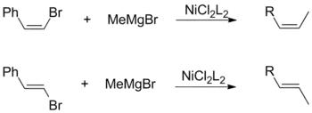 Tanto los haluros de olefina cis como los trans promueven la retención general de la configuración geométrica cuando se combinan con un alquilo de Grignard. Esta observación es independiente de otros factores, incluida la elección de los ligandos del catalizador y los sustituyentes vinílicos.[12]