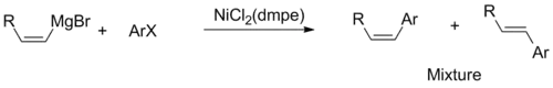 Por el contrario, un acoplamiento de Kumada que utiliza reactivos vinílicos de Grignard procede sin estereoespecificidad para formar una mezcla de alquenos cis y trans. El grado de isomerización depende de una variedad de factores, incluidas las proporciones de los reactivos y la identidad del grupo haluro. Según Kumada, esta pérdida de estereoquímica es atribuible a reacciones secundarias entre dos equivalentes del reactivo alílico de Grignard.[12]