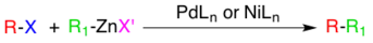 El acoplamiento de Negishi es una reacción de acoplamiento cruzado catalizada por metales de transición ampliamente utilizada. La reacción acopla halocarburos o triflatos con compuestos organometálicos de zinc, formando enlaces carbono-carbono (C-C) en el proceso. Generalmente se utiliza una especie de paladio (0) como catalizador metálico, aunque a veces se usa níquel.[1][2] Se puede emplear una variedad de catalizadores de níquel en estado de oxidación Ni0 o NiII en acoplamientos cruzados de Negishi como Ni(PPh3)4, Ni(acac)2, Ni(COD)2, etc.[3][4][5]
