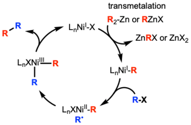 Para electrófilos alquílicos no activados, un posible mecanismo es un primer mecanismo de transmetalación. En este mecanismo, las especies de alquil zinc primero se transmetalarían con el catalizador de níquel. Luego, el níquel abstraería el haluro del haluro de alquilo dando como resultado el radical alquilo y la oxidación del níquel después de la adición del radical.[18]