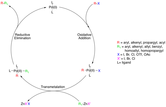 Tanto los haluros de organozinc como los compuestos de diorganzinc pueden usarse como materiales de partida. En un sistema modelo, se encontró que en el paso de transmetalación, el primero da el aducto cis R-Pd-R ', lo que resulta en una rápida eliminación reductora del producto, mientras que el segundo da el aducto trans que tiene que pasar primero por un proceso de isomerización trans-cis lento.[13]