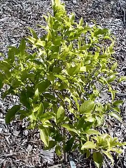 Alcanza un tamaño de alrededor de 9 metros de altura y un diámetro de tallo de 20 cm, con una corona de hojas verdes brillantes. El tronco es liso, negro, cilíndrico y torcido. Las ramillas suaves y de color verde, girando a gris.