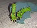 Las larvas pasan por cinco estadios (mudas o etapas). El primer estadio es naranja/marrón, con una banda negra alrededor de los segmentos del medio. El ancho de la banda oscura es variable. La larva tiene una cápsula cefálica de color marrón oscuro. La larva cambia a verde al comienzo del segundo estadio, desarrollando tubérculos de color rojo/naranja hacia el final del segundo estadio. En el cuarto estadio, los tubérculos se vuelven negros y espinosos. Los estadios posteriores también desarrollan un patrón de puntos blancos. La larva puede alcanzar una longitud máxima de aproximadamente 9-10 centímetros y una masa de 15 gramos.