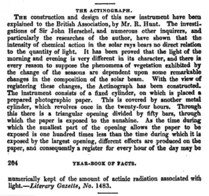 Los primeros actinógrafos eran dispositivos que funcionaban de forma continua durante 24 horas, utilizando un cilindro de papel fotográfico (rotado mediante un mecanismo de relojería) expuesto a la luz mediante una ranura en forma de cuña, mediante el que se registraba una gráfica de la intensidad actínica de la luz durante el periodo de un día; de ahí el sufijo grafo en actinógrafo. Estos dispositivos fueron desarrollados y descritos por Robert Hunt, secretario de la Real Sociedad Politécnica de Cornualles en 1845, como una mejora del heliógrafo desarrollado por T. B. Jordan en 1839.[2]