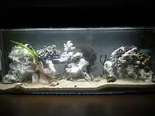 La roca viva es aquella que ha estado en el océano, compuesta de piedra caliza y esqueleto de coral en descomposición, generalmente alrededor de un arrecife de coral como los que se encuentran alrededor de Fiji, y generalmente está cubierta con algas beneficiosas, coralina y diminutos invertebrados y bacterias que son deseables en el acuario. . Algunos ejemplos de la microfauna que se encuentra comúnmente en la roca viva son los cangrejos, los caracoles, los plumeros, las estrellas quebradizas , las estrellas de mar, las lapas, los abulones y, ocasionalmente, los erizos de mar, las anémonas de mar, los corales y las esponjas de mar . Además, si el aficionado no tiene suerte, una gamba mantis. Los gusanos de cerdas también son comunes, la mayoría de los cuales, aunque poco atractivos, no son dañinos y son carroñeros útiles; sin embargo, algunas especies pueden ser plagas. La adición de roca viva es una de las mejores formas de asegurar un acuario saludable, ya que la roca proporciona un amortiguador para mantener un pH alto (8,0-8,3), alcalinidad y capacidad neutralizadora de ácidos. La alcalinidad a menudo se conoce por un término bastante confuso, " dureza de carbonato ", o KH. Esto generalmente se mide en "grados" (dKH) o meq/L.