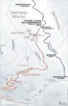 El acueducto comenzaba en una fuente en la zona de Nettersheim, en el valle del río Urft. Desde ahí iba por el valle hasta Kall, donde tenía que trasponer la divisoria de las cuencas del Mosela y el Rin. Los ingenieros romanos eligieron este punto porque allí podían superar la divisoria sin recurrir a un túnel o una bomba. El acueducto discurría entonces paralelo a la montaña Eifel, al norte, cruzando el río Erft cerca de Kreuzweingarten (en el distrito de Euskirchen) y el arroyo Swist con un puente en arco. En Kottenforst, al noroeste de Bonn, atravesaba las montañas Vorgebirge. Finalmente, cruzaba Brühl y Hürth antes de llegar a Colonia. Otros manantiales de la región que cumplían con los requisitos romanos en cuanto a calidad y caudal también fueron equipados con acueductos que desembocaban en el principal.