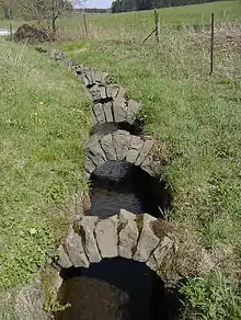 Como protección contra las filtraciones, las paredes laterales y el lecho de las zanjas, están sellados con césped o arcilla. Donde la zanja cruza arroyos, hay vertederos, por los que se puede regular el flujo de agua en la acequia. Cuando los niveles de agua son altos, hay que abrir los vertederos, es decir, las tablas que controlan el flujo deben quitarse o subirse.