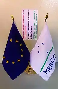 El Acuerdo de libre comercio Mercosur-Unión Europea es un tratado de libre comercio entre el Mercosur y la Unión Europea. Ambos bloques llegaron a un acuerdo de principio en 2019. El acuerdo se anunció el 28 de junio en la cumbre del G20 de Osaka de 2019 después de veinte años de negociaciones.[1][2] Si bien existe acuerdo en principio, los textos definitivos no han sido finalizados, firmados ni ratificados y por lo tanto no han entrado en vigor. Si se ratifica, representaría el mayor acuerdo comercial alcanzado tanto por la UE como por el Mercosur en términos de ciudadanos involucrados.[2] El acuerdo comercial es parte de un Acuerdo de Asociación más amplio entre los dos bloques. Además del comercio, el acuerdo de asociación también se ocuparía de la cooperación y el diálogo político. Las negociaciones sobre estas dos partes concluyeron el 18 de junio de 2020.[3]