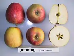 ![]() La variedad de manzana 'Adams's Pearmain' con secciones cruzadas. | ||