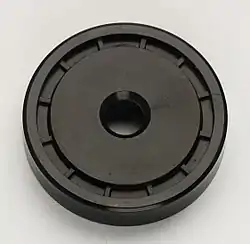 A partir de entonces, los nuevos tocadiscos pasaron a incluir una pieza de plástico con forma de disco perforado en su centro (su forma recuerda a la pastilla que se utiliza en el hockey sobre hielo, por lo que en inglés se denomina coloquialmente como puck), que insertada en el eje metálico central, permitía situar correctamente los discos de 45 rpm para ser reproducidos. Los insertos fijos del tipo spider tenían la misma función, pero con la ventaja de que podían apilarse varios discos para su reproducción secuencial automática en los mecanismos que con este fin solían incluir muchos tocadiscos para reproducir LPs en serie.