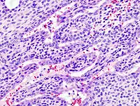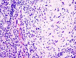 ![]() Adenoma pleomórfico con epitelio mixto (izq) y componentes celulares mesenquimatosos (der). Estos últimos exhiben apariencia mixofibroso y cierta diferenciación condromatosa. | ||