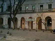 En la fachada del cuerpo central, podemos ver grandes pilares y los arcos de medio punto de las galerías. Cuenta con dos alas laterales de menor altura.