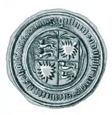 Su sello muestra los abrigos-de-armas de Schleswig (dos leones) y Holstein (el tan-llamados stylised hoja de ortiga). El inscription dice: SIGILLUM*ADOLPHI*DUCIS*SLEVICENSIS*HOLTSACIE*COMITIS (Sello • de Adolphus • Duque • de Schleswig • Holstein • Cuenta)