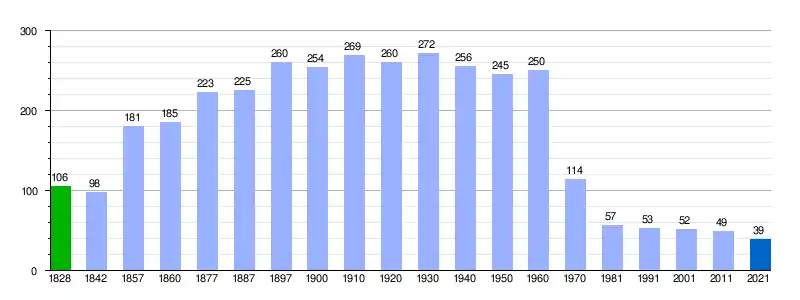 Gráfica de evolución demográfica de Adrada de Pirón[6] entre 1828 y 2021 |