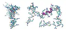 La adrenomedulina se compone de cincuenta y dos aminoácidos, tiene un enlace de disulfuro intramolecular y muestra una pequeña homología con el péptido relacionado con el gen de la calcitonina (CGRP por sus siglas en inglés). El precursor, llamado preproadrenomedulina, tiene ciento ochenta y cinco aminoácidos. Mediante un análisis de la transferencia del ARN, se encontró adrenomedulina humana mARN en todos los tejidos, con una expresión más elevada en la placenta, las células adiposas, el pulmón, los islotes pancreáticos, el músculo liso y la piel. El gen humano de la ADM se localiza en un solo locus en el cromosoma 11, con cuatro exones y tres intrones. El gen ADM está codificado originalmente como péptido precursor de 185 aminoácidos, que puede escindirse diferencialmente para formar cierta cantidad de péptidos, incluyendo un ADM inactivo de 53 aminoácidos, e PAMP, adrenotensina y AM95-146. La ADM humana se activa para formar cincuenta y dos aminoácidos, seis anillos de aminoácidos, que comparten una estructura moderadamente similar a la familia de la calcitonina de péptidos reguladores (calcitonina, CGRP y amilina). El ADM circulatorio está compuesto por la forma activa de la amida (15%) y por la forma inactiva glicosilada (85%). Tiene una vida media plasmática de 22 minutos, un ratio de eliminación de 274 mililitros por kilogramo por minuto, y un volumen de distribución aparente de 880 ± 150 ml/kg. La ADM madura se degrada por la aminopeptidasa neprilisina.