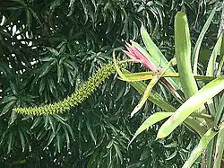 Son epífitas, alcanzando un tamaño de 90-120(-300) cm en flor. Hojas 69-107 cm; vainas 13-18 cm de ancho, ovadas, pardo oscuro, densamente lepidotas, enteras; láminas 4-7.5 cm de ancho, liguladas, adpreso lepidotas a glabrescentes, toscamente serradas, agudas a redondeadas y acuminadas. Escapo de 40-50 cm, erecto a arqueado-recurvado, peloso; brácteas más largas que los entrenudos pero escasamente divergentes y el escapo expuesto, las brácteas inferiores enteras, las superiores conspicuamente serradas. Inflorescencia 25-65 cm, 1(-3?)-pinnado compuesta, con más de 35 espigas, densamente cilíndrica; raquis terete a inconspicuamente angulado o sulcado, glabro; brácteas primarias hasta c. 3 cm, moniliforme-espinosas, enteras; espigas patentes, con 1-4(-5) flores dísticas, a menudo con brácteas apicales espinosas estériles. Brácteas florales 2.5-3.2 cm, más de 2 veces el largo (incluyendo el ápice espinoso) de los entrenudos, la porción basal 1.1 x 1.5-1.8 cm, muy anchamente ovadas, formando un cáliz y encerrando gran parte del ovario, el ápice moniliforme-espinoso hasta c. 2 cm. Flores sésiles o casi sésiles; sépalos 15-17 mm, libres o connatos hasta 1 mm, asimétricos, anchamente agudos a obtusos, inermes, glabros; pétalos amarillo-verdoso pálido.[1]