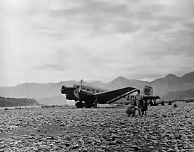 ![]() Junkers Ju 52/3m de la aerolínea Eurasia sobre el empedrado del aeródromo | ||