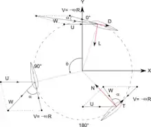 Las fuerzas y las velocidades actuando en una turbina Darrieus son descritos en la figura 1. El vector de velocidad resultante, , es la suma vectorial de la velocidad de las corrientes de aire entrantes, , y el vector velocidad del aspa avanzando,