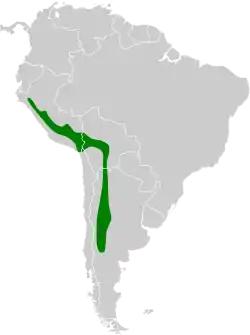Se encuentra en las zonas de matorral de montaña de Argentina, Bolivia, Chile, y Perú.