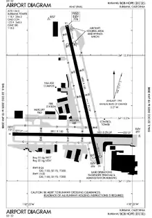 Originalmente, el aeropuerto estaba ubicado completamente dentro de los límites de la ciudad de Burbank, pero el extremo norte de la Pista 15/33 se ha extendido desde entonces a la ciudad de Los Ángeles.