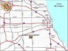 El Aeropuerto Internacional Midway (en inglés, Chicago Midway International Airport) (IATA: MDW, OACI: KMDW, FAA LID: MDW), también conocido como Aeropuerto Midway o Midway, es un aeropuerto en Chicago, Illinois, Estados Unidos, localizado en el lado suroeste de la ciudad, a 13 kilómetros del Loop de Chicago. El actual código IATA MDW ha sido usado desde 1949 cuando el Aeropuerto Municipal de Chicago fue renombrado por Airport Chicago Midway,[3] a pesar de que los vuelos de programación continuaron nombrándolo CHI hasta que comenzaron los vuelos en el Aeropuerto O'Hare. Está rodeado por la Calle 55, la Avenida Cicero (entrada de la terminal), la Calle 63, y la Avenida Central. La parte norte del aeropuerto está dentro del área comunitaria de Garfield Ridge y la parte sur en el barrio de Clearing. El aeropuerto es administrado por el Chicago Airport System, que también supervisa las actividades del Aeropuerto Internacional O'Hare y el Aeropuerto Internacional de Gary-Chicago.[4] El aeropuerto lleva el nombre de la Batalla de Midway durante la II Guerra Mundial.