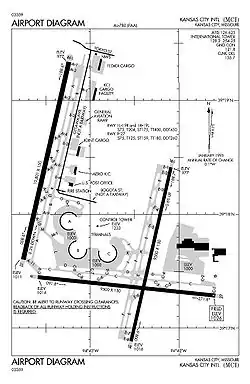 El aeropuerto internacional de Kansas City ocupa un área de 10,200 acres (4,128 ha) que posee tres pistas. En 2007, el aeropuerto tuvo 194,969 operaciones, una media de 534 al día.[3]