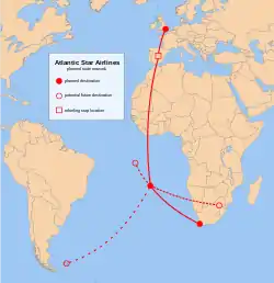En junio de 2013 de Atlantic Star Airlines, que fue constituida en Inglaterra y Gales el 20 de noviembre de 2012,[24] anunció que haría una oferta por el contrato para volar a Santa Elena cuando el aeropuerto abra en 2016.[25] Se planea explotar una ruta que operará desde el Reino Unido (haciendo una escala en Madrid para cargar combustible), pase por la isla y luego a Ciudad del Cabo usado aviones Boeing 757. Agregando una ruta más a Johannesburgo en un plazo relativamente corto, así como las conexiones aéreas con menos frecuencia a la isla Ascensión y las Islas Malvinas también están bajo consideración.[19][26] En este último territorio, reclamado por Argentina, los vuelos partirían desde la Base Aérea de Monte Agradable.[27]