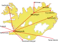 Air Iceland opera vuelos a Grímsey, Reikiavik, Keflavík, Þórshöfn y Vopnafjörður, Iceland Express a Copenhague en ciertos periodos del año y Icelandair a Keflavík.