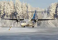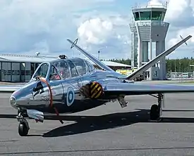 ![]() Avión de la fuerza aérea finlandesa. Detrás del avión la torre de control del aeropuerto. | ||||