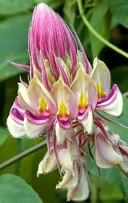Son arbustos, escandentes. Las estípulas caducas. Hojas imparipinnadas. Inflorescencias axilares o caulifloras en racimos o panículas alargadas, con grandes brácteas imbricadas de cola serícea que cubren las yemas florales, caducas. Bractéolas diminutas. Corola estándar basalmente con 2 callos laminares curvos, alas y quillas iguales en longitud. Legumbres infladas, tardíamente dehiscentes; válvulas densamente arboladas. Semillas 1 [2] o leguminosas, elipsoides.[2]