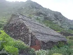 Mantiene una arquitectura tradicional canaria en forma de casas-cueva y viviendas campesinas de piedra seca y techumbre de paja llamados pajares.