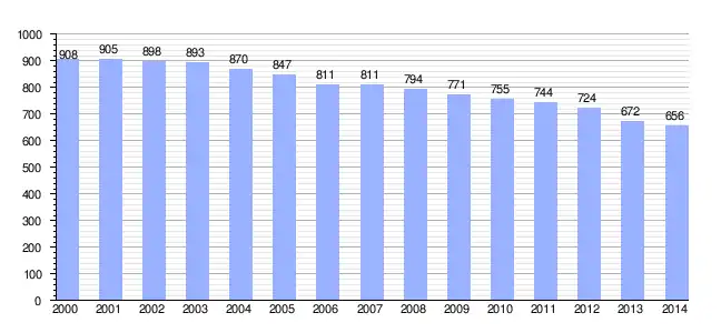 Gráfica de evolución demográfica de Agüeria entre 2000 y 2014 |