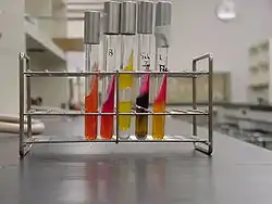 Resultados de un agar TSI: (de izquierda a derecha) preinoculado (como control), P. aeruginosa, E. coli, Salmonella Typhimurium, Shigella flexneri.
