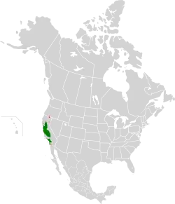 ![]() Área de distribución del tordo tricolor. Destacan las poblaciones del Valle Central y del sur de California. | ||