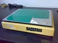 - Agitador magnético (con o sin calefactor): Es una placa metálica sobre la que se coloca un vaso de precipitados o recipiente de fondo plano que contiene el líquido o la disolución que debe ser agitada. En ella se introduce el imán del agitador, una pequeña barra imantada cubierta de plástico inerte. Un motor eléctrico bajo la placa produce fuerzas magnéticas que ponen en rotación el imán, provocando el movimiento circular del líquido. La velocidad de rotación puede ser controlada. En muchos casos existe un sistema de calefacción eléctrico para controlar la temperatura.
