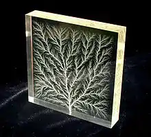 Ruptura de dielétrico debido a alta tensión cen un bloque de plexiglás genera un patrón fractal (dimensión fractal: Df ~ 1,75[2]) llamado figura de Lichtenberg. Las ramas de descarga adquieren formas capilares en los extremos, pero se cree que ello continúa a nivel molecular.[3]