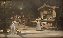 Como personajes de la época y propios de este lugar que enriquecen el ambiente van saliendo los barquilleros con su barquillera de ruleta colgada de un hombro, los guardias que dialogan, con su acento gallego, el músico callejero medio mendigo medio truhan, las aguadoras y sus chulos (o novios) que vienen de desempeñar el tesoro típico que no podía faltar: el mantón de Manila. La escena se completa con las niñeras, las amas de cría y las criaturas que están a su cuidado; los más grandecitos juegan a la comba, a la piedra o avión, al aro y al corro. El público se deleita con el ambiente veraniego en vísperas de la verbena de San Lorenzo; todo lo que acontece es reconocible y reconocido por los espectadores. En el estreno de 1897 contribuyeron a la perfecta ambientación los decorados de Giorgio Busato y de Armesto, especialmente el telón de fondo donde estaba pintada la entrada del Paseo de Recoletos. [8]