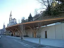 En 2002 se introdujo el Paseo del Agua, a través del Gave y ligeramente aguas abajo de la Gruta. Consiste en una serie de nueve estaciones en las que hay una pequeña fuente de agua de Lourdes. Las estaciones forman una pasarela a lo largo del Gave que se puede seguir en cualquier dirección. Mientras caminan, se invita a los peregrinos a lavarse o beber y a meditar en pasajes de la Biblia . Cada estación lleva un título de la Virgen María, como "Reina de los Apóstoles", " Madre del Buen Consejo " y " Nuestra Señora de la Luz ". [11]